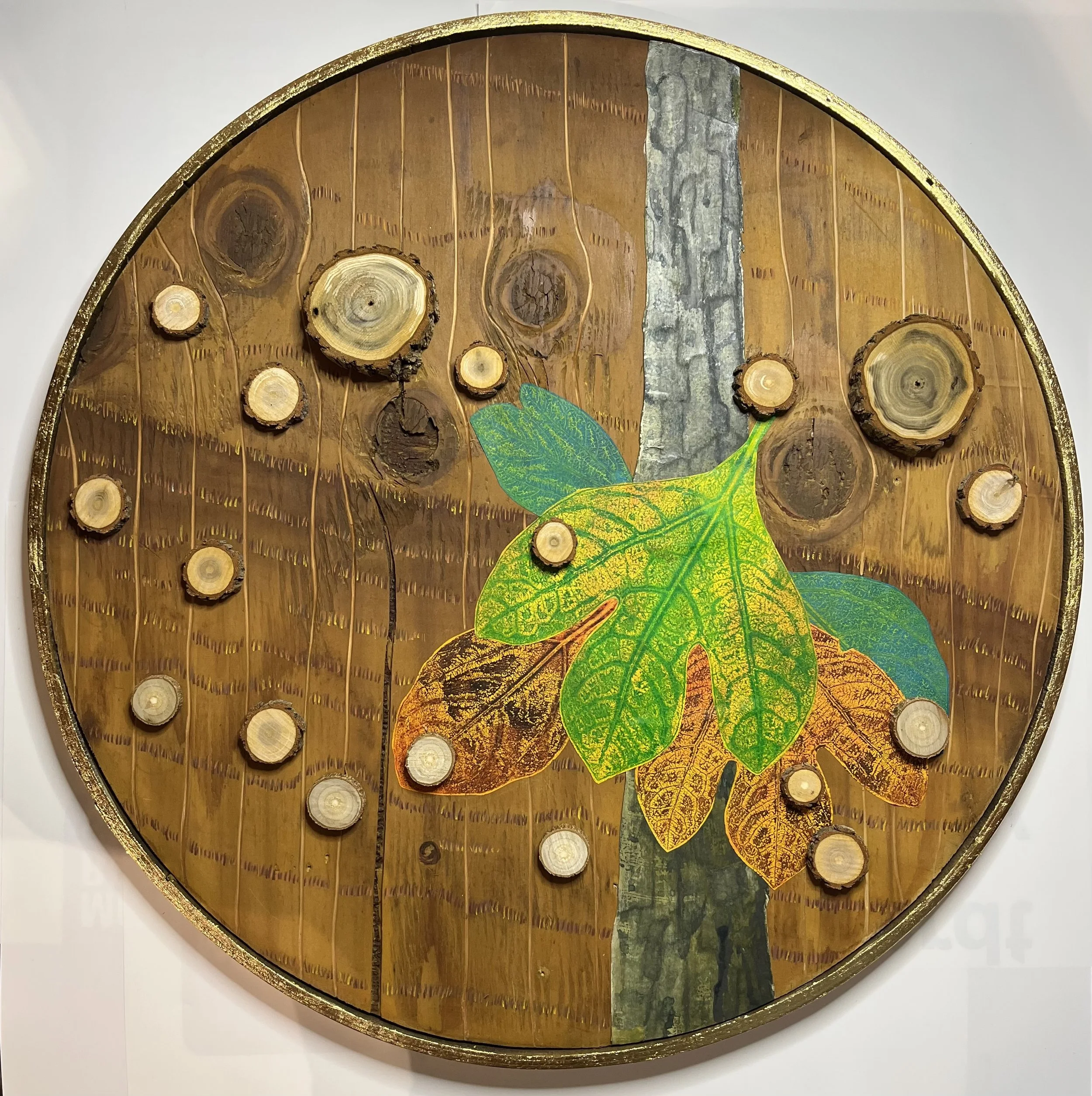 "Sassafras Wheel" 2025 Mixed media on reclaimed plywood; 18" diameter